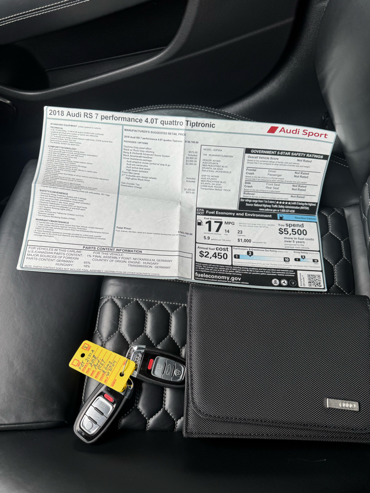 Two Owner. Great Service History with 37 service records on the CarFax. Performance Model - 605 Horsepower - Amazing Driving experience. All Wheel Drive. Bang & Olufsen Advanced Sound System. Black Alcantara Headliner. Driver Assistance Package. Adaptive Cruise Control. Audi Pre Sense Plus. Audi Active Lane Assist. 21 inch Wheels with 4 Brand New Tires. Heated Leather Seats. Moonroof / Sunroof. Navigation. Smartphone Interface. $143,150 Sticker Price New.